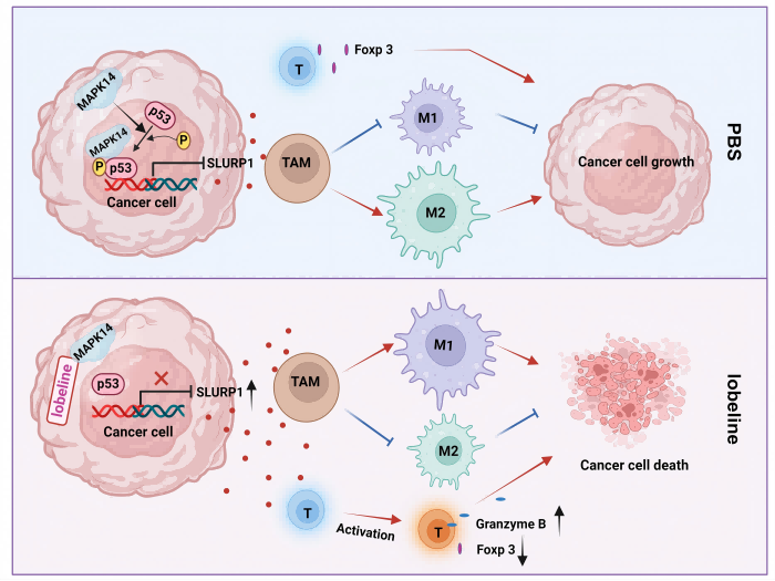 为解决上述问题,该研究团队结合使用单细胞多组学和无标记靶标垂钓技术,发现山梗菜碱可直接靶向MAPK14,通过调控p53/Slurp1信号通路促进肿瘤相关巨噬细胞(TAM)向抗肿瘤表型转变,发挥抑制结直肠癌生长的作用。此外,联合使用山梗菜碱和anti-PD-1可协同增效,能更好抑制结直肠癌的进展。